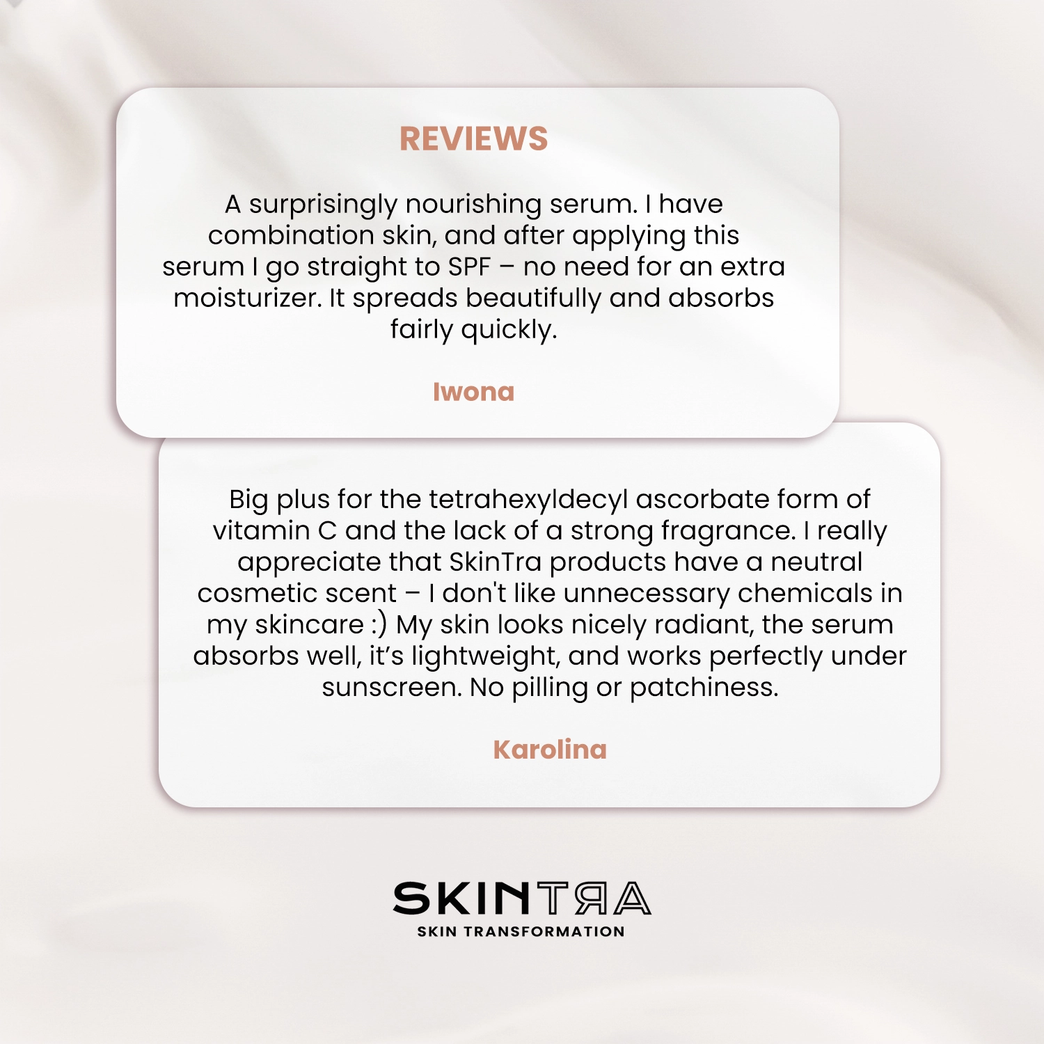 Our serum is in the form of a light emulsion, which ensures that the product is more comfortable to use than the oil form, which is popular for this form of vitamin C. It does not leave a heavy or greasy feeling, making it suitable for all skin types, both morning and evening.