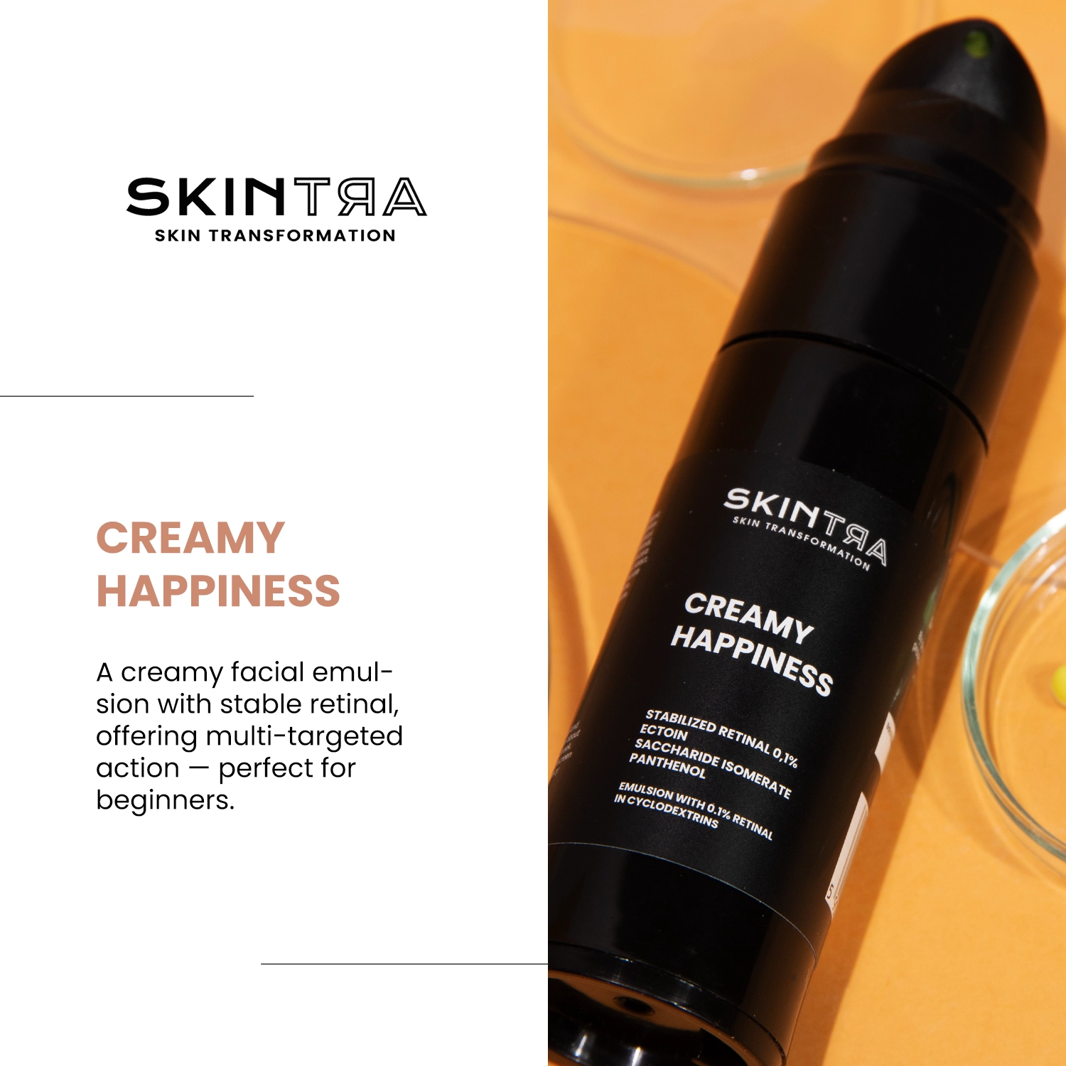 The effectiveness of retinal encapsulated in an emulsion stable formula. The technology used to encapsulate retinal in cyclodextrin ensures better stability of this sensitive raw material. Cyclodextrins have complexing properties, allowing hydrophobic ingredients such as retinal to "hide" inside them. In this way they help improve its stability, since on its own it is a very sensitive substance to oxidation, or light - it can degrade upon contact with these factors.