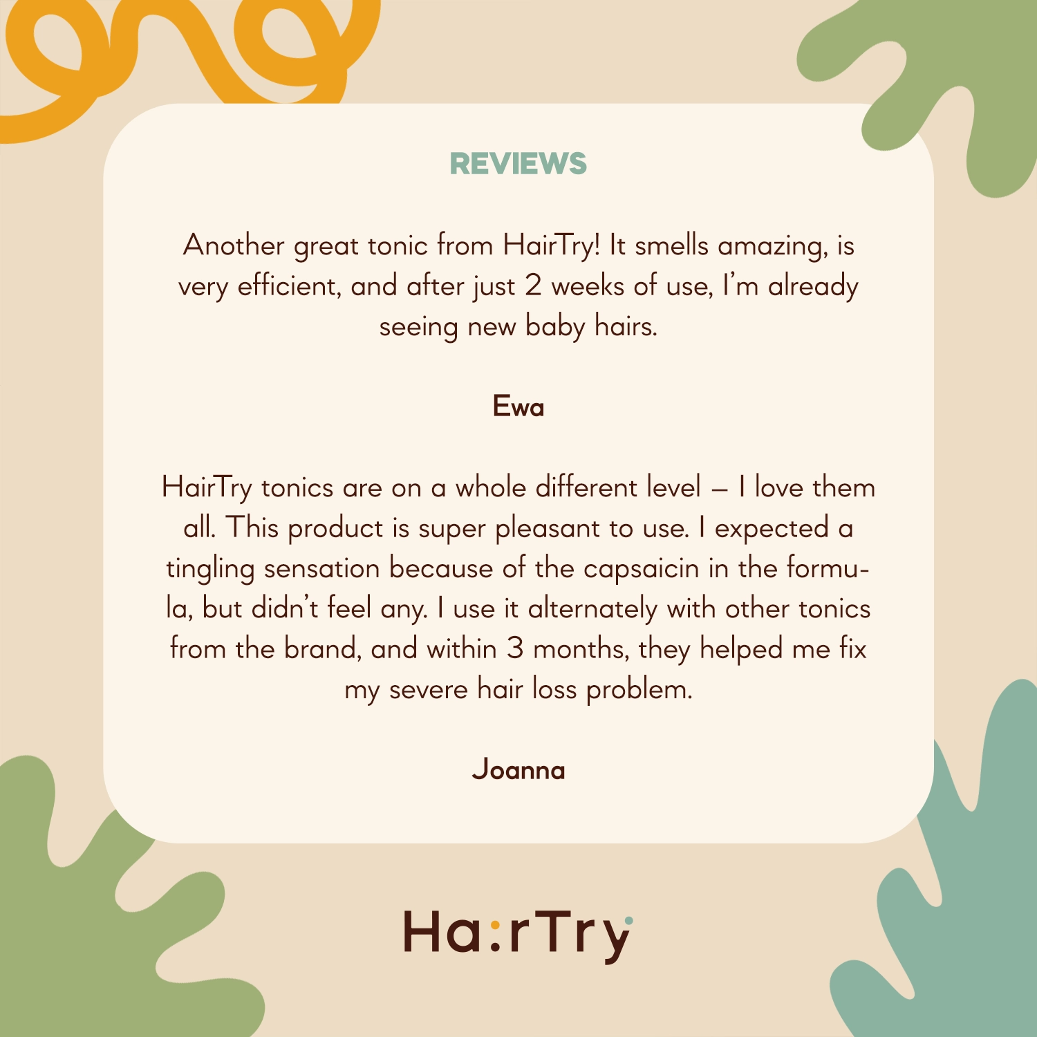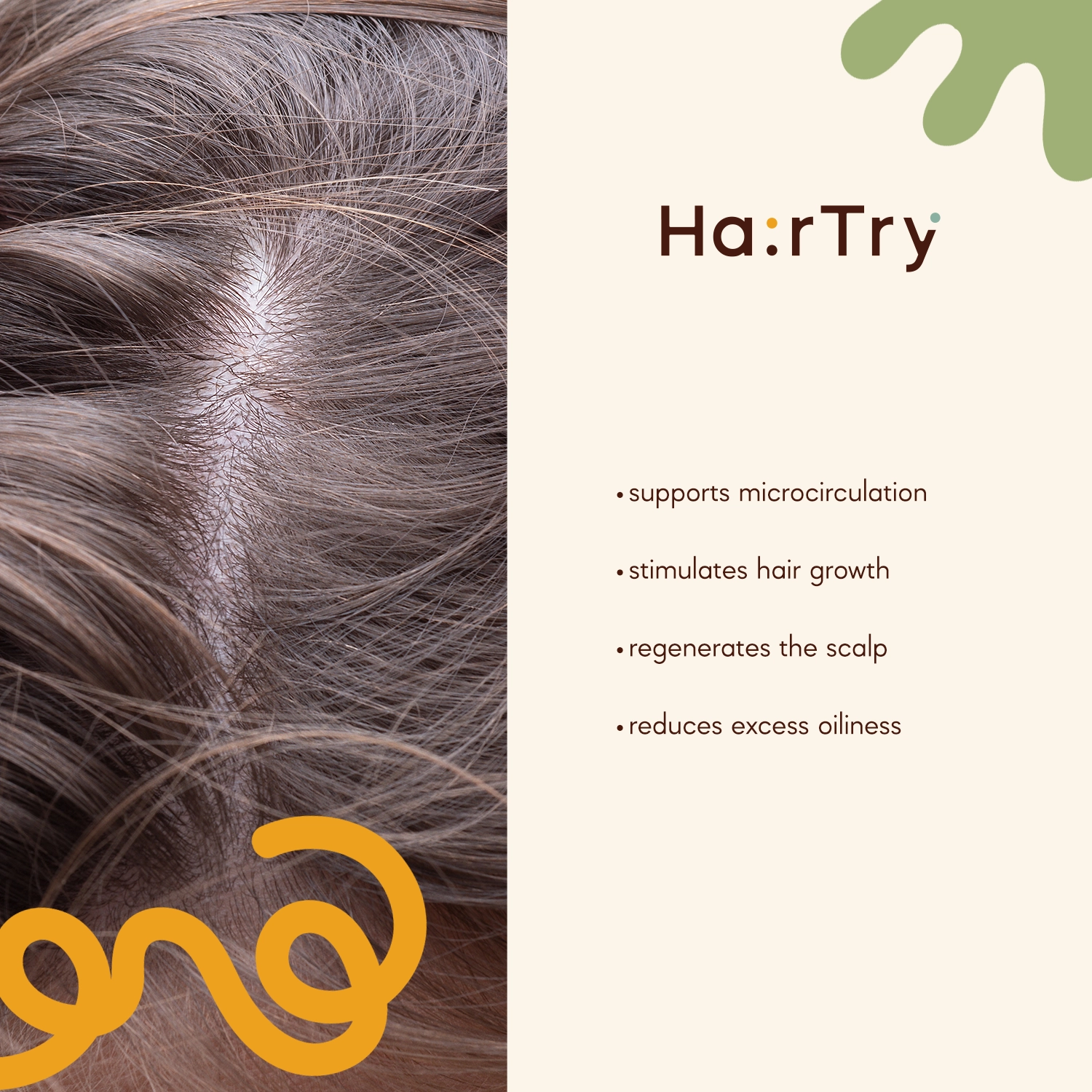 HairTry - Marry Rosemary is a versatile scalp lotion with benefits for both the scalp and hair. Thanks to its content of rosemary oil and capsaicin, the product naturally stimulates microcirculation around the hair follicle and bulb, promoting nourishment, oxygenation, and healthier growth of both baby hairs and existing strands. In addition, a B-vitamin complex, including niacinamide and biotin, provides comprehensive care for the scalp and hair. The lotion helps regulate sebum production, reducing oily scalp issues, strengthens the skin barrier, soothes and calms irritation, and minimizes unpleasant itching. The formula is further enriched with rosemary glucoside, which combats scalp aging, supports regeneration, and helps prevent hair loss. The combination of these ingredients creates a lightweight, non-greasy lotion with a herbal-rosemary scent and warming effect, stimulating hair growth, regulating sebum, providing anti-inflammatory benefits, and moisturizing the scalp. We recommend this product for weakened hair, slow-growing hair, irritated or itchy scalps, oily hair, or fine strands. The lotion comes in a convenient bottle with an applicator and is suitable for vegans and vegetarians.