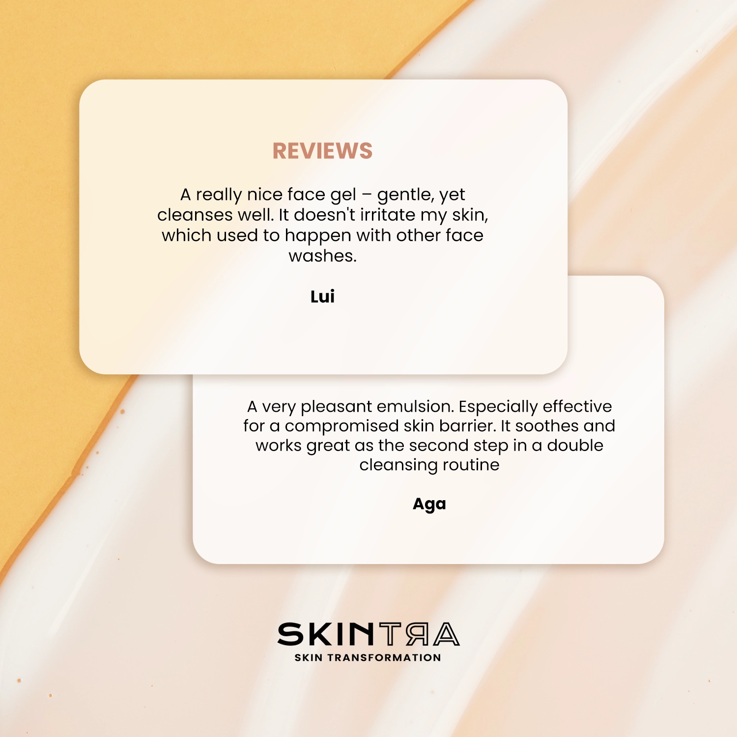 In addition to gentle cleansing ingredients, the emulsion also contains ingredients that support the hydrolipid barrier, so it not only cleanses the skin, but also helps to maintain an adequate level of hydration and has a nurturing effect already at the washing stage.